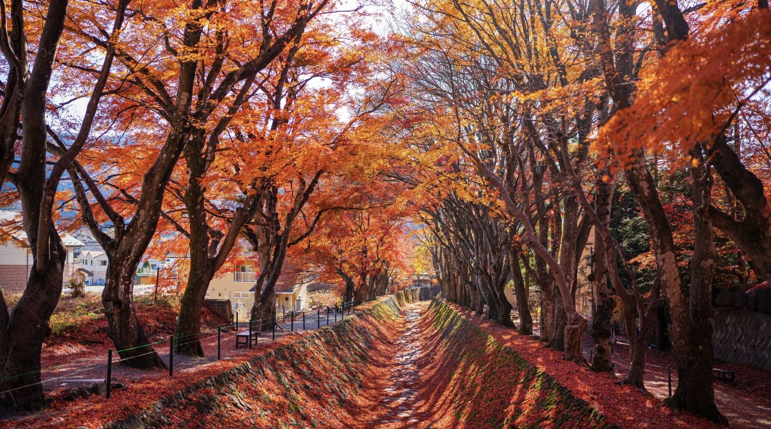 붉은 단풍 나무가 길게 늘어서 있어 단풍 터널을 지나는 듯한 환상적인 풍경을 선사합니다.